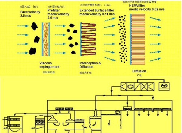 空調送風系統通過一定的流速將灰塵送到過濾系統當中,初級過濾器將5um以上大顆粒灰塵留在過濾表 面,中效過濾器將1um-5um顆粒抓取,高效過濾器將0.3um-0.5um以上灰塵顆粒過濾,從而保證無塵車間等級!