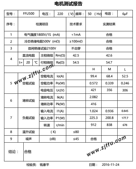 FFU500電機測試報告 型號:FFU500 電壓:220 (V) 頻率:50 (Hz) 電容:6mF 1、檢測項目:電氣強度1800V/1S (mA);技術要求:<1mA;實測結果:合格。 2、檢測項目:冷態絕緣電阻500V (mQ);技術要求:>100mQ;實測結果:合格。 3、檢測項目:匝間絕緣試驗2100V;技術要求:不擊穿;實測結果:合 …