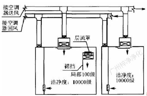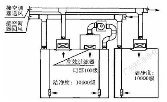 此方式的缺點是設(shè)置循環(huán)風(fēng)機箱及處理噪聲,需要較大的空間,而通常百級區(qū)周圍風(fēng)管都比較密集,需要精心布局。此方式百級區(qū)上部靜 壓箱相對百級區(qū)室內(nèi)為正壓,頂棚高效過濾器與吊架間的滲漏,為靜壓箱流向室內(nèi),直接影響百級區(qū)潔凈度。對施工質(zhì)量要求較高。(具 體可參考:
