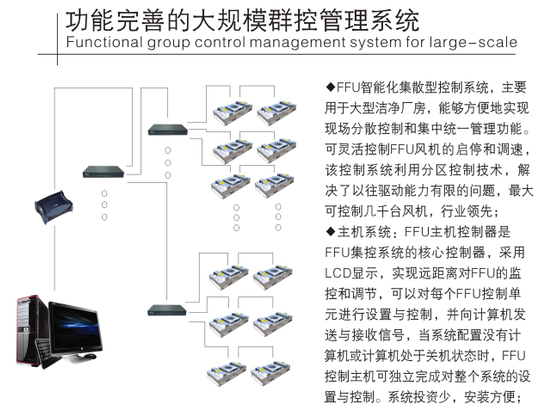 FFU群控系統(tǒng),主要用于大型潔凈房間,能夠方便地實現(xiàn)現(xiàn)場分散控制和集中統(tǒng)一管理功能。可靈活控制FFU風(fēng)機(jī)的啟停和調(diào)速,該控制系統(tǒng)利用分區(qū)控制技術(shù),解決了485驅(qū)動能力有限的問題,最大可控制幾千臺風(fēng)機(jī),F(xiàn)FU群控系統(tǒng),高等級凈化廠房使用。